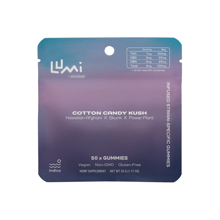 Lumi Cotton Candy Kush Indica Gummies are crafted for evenings when it is time to unwind and let the day go. Each gummy contains hemp derived Delta 9 THC paired with strain specific terpenes designed to guide the experience toward relaxation and calm.